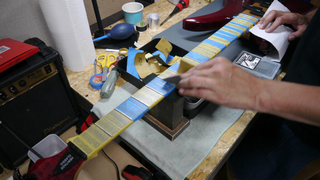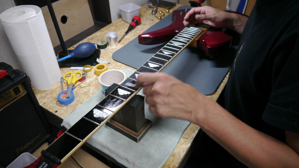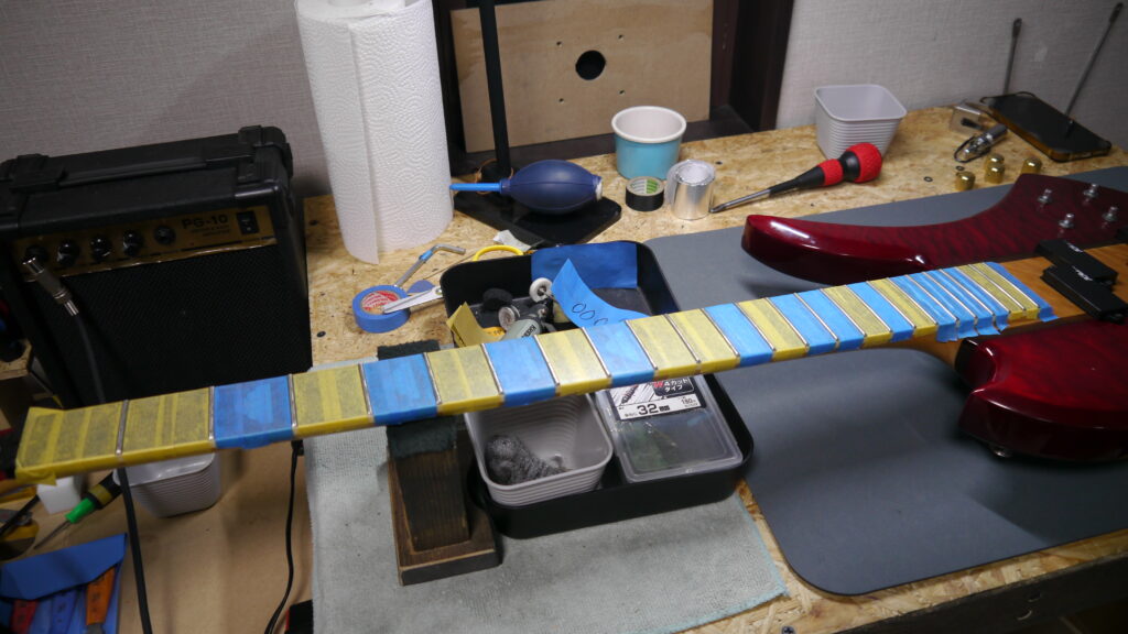 いつものようにマスキングテープで保護しながらフレットを磨き、その後も木材の様子を見ながらしっかりとケアを施してまいります✨🔧