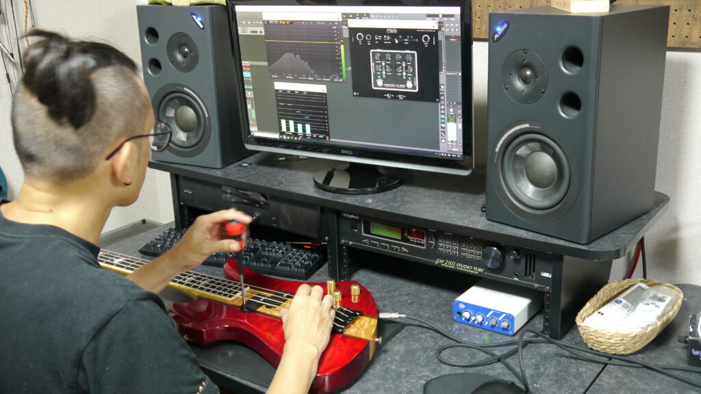 パソコンに繋いで、オクターブ調整、ピックアップ調整等を実施し、お客様のご要望とお預かりした楽器に合わせて、調整を続けていきます🎛️💻✨🔧🎸