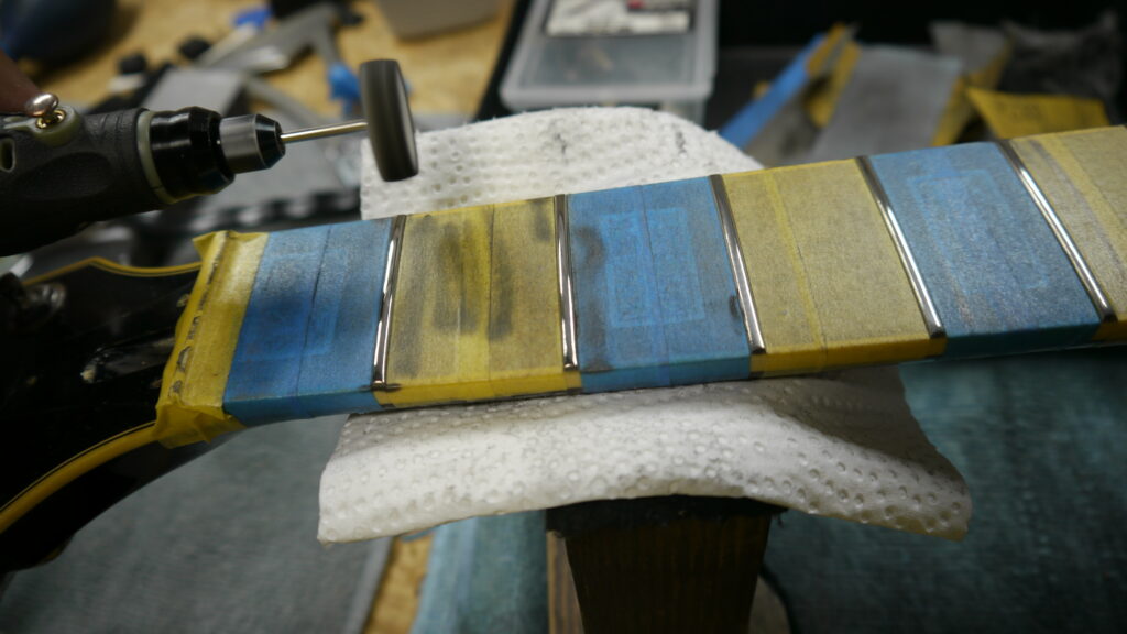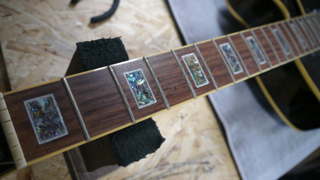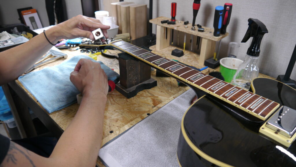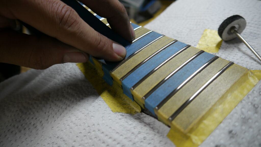 フレットに適切な丸みをつけ、この後光沢が出るよう丁寧に仕上げました✨🔧