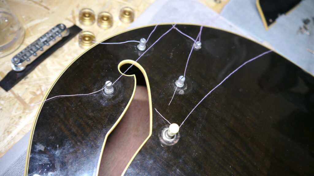 このギターではこのように糸に繋いで、電装系の一時取り出し診断をしていきます。
