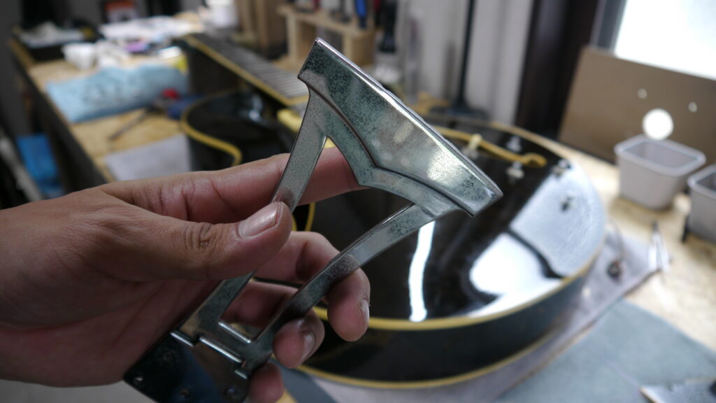 テールピース部分にも経年による白サビや汚れが付着しておりました。こちらも丁寧にキレイにしていきます🧼✨