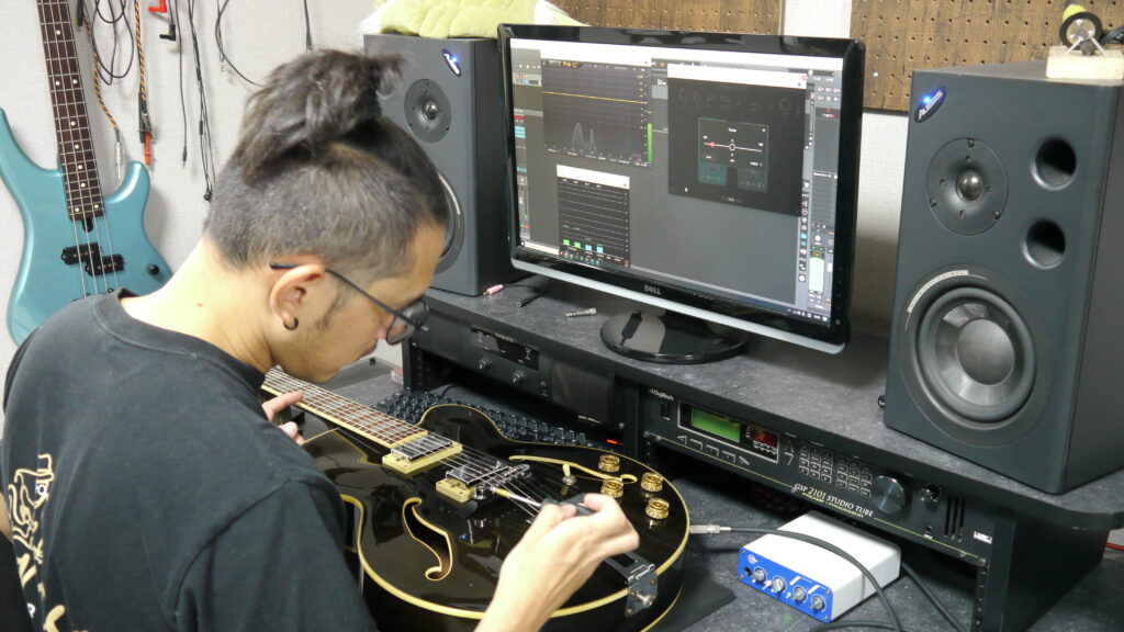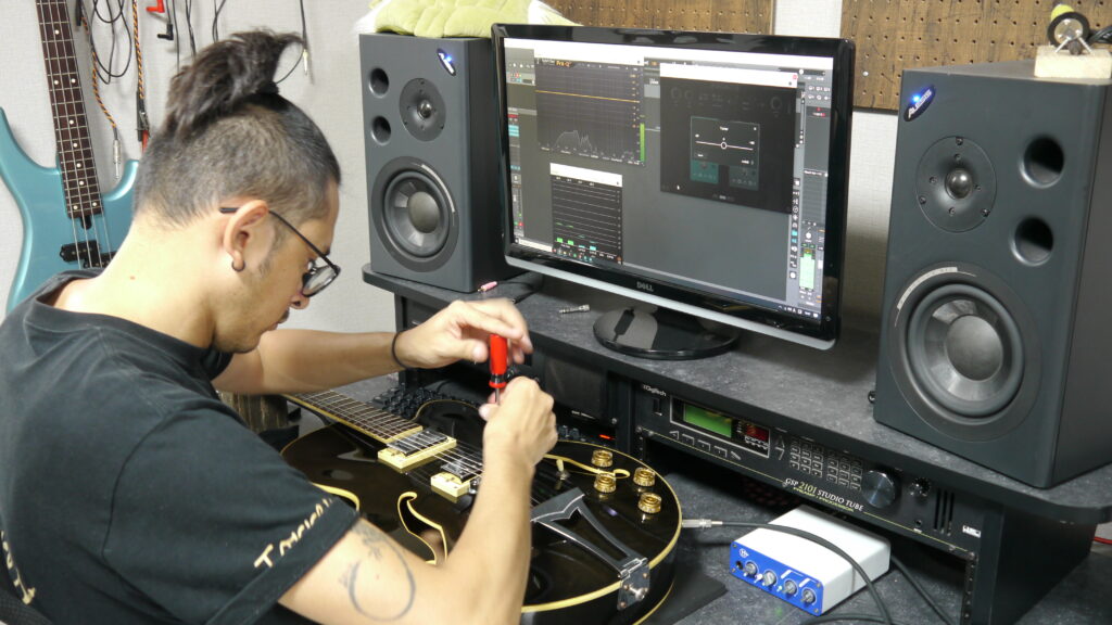 オクターブ調整、ピックアップ調整を行っております。パソコンに繋いで音程の正確さを計測しながら、全ポジションで安定したピッチを実現。さらにピックアップの高さを微調整し、各弦の出力バランスを最適化してまいります🎛️💻