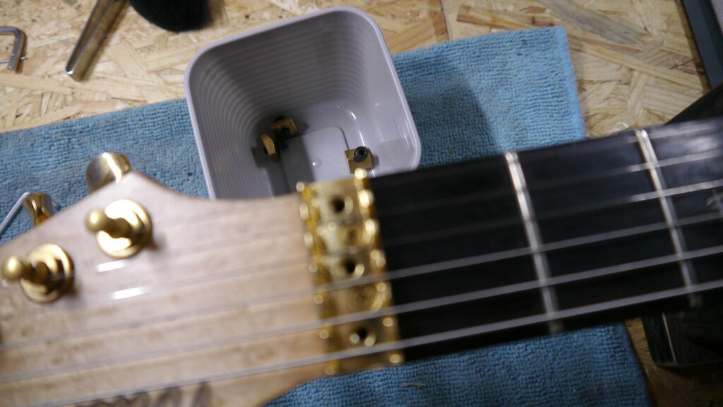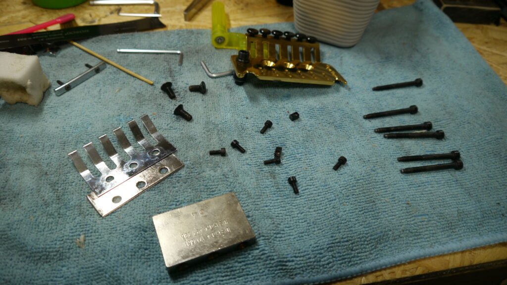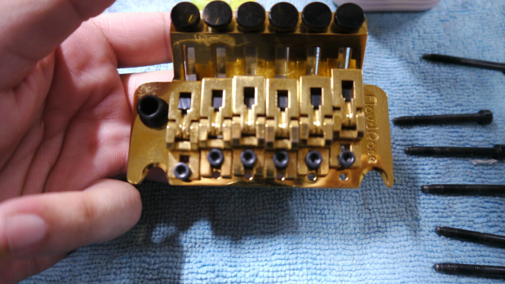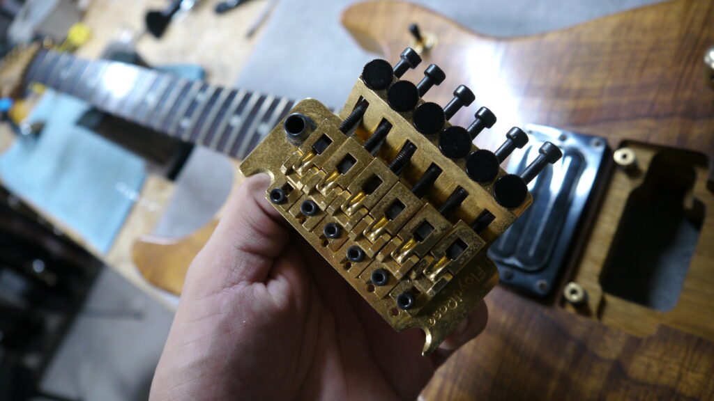 今回はディープクリーニングのため、フロイドローズをバラしてクリーニングを進めます。細かいパーツ一つひとつを丁寧に分解し、汚れを徹底的に除去してまいります🧼✨