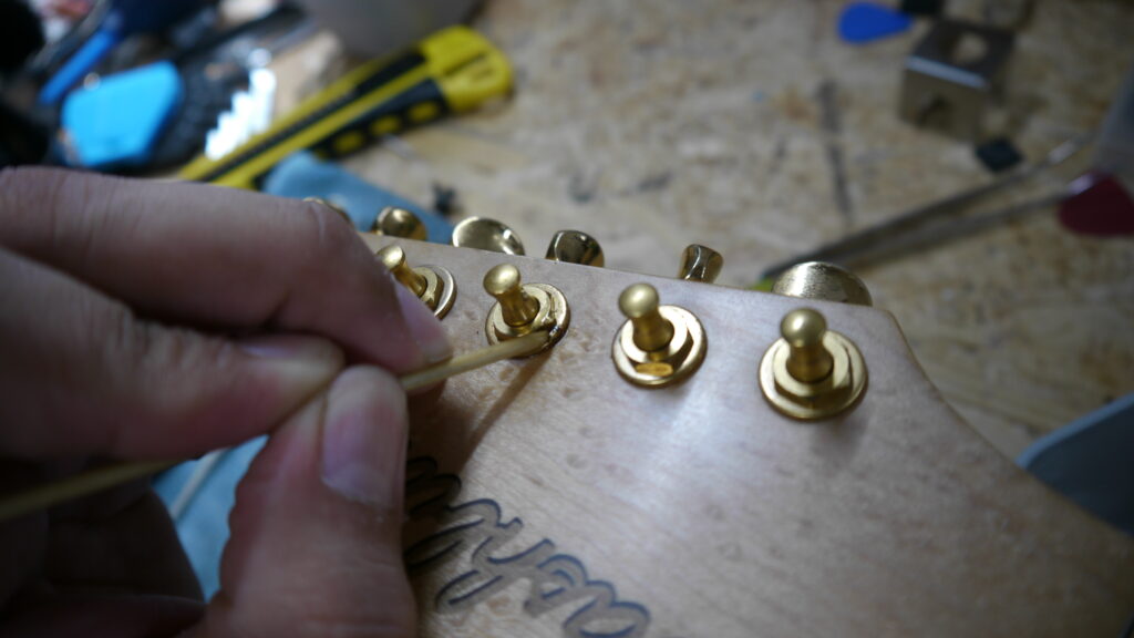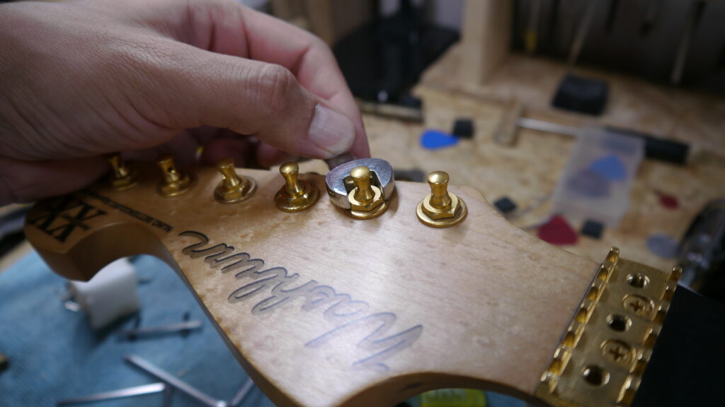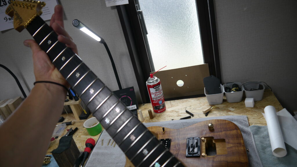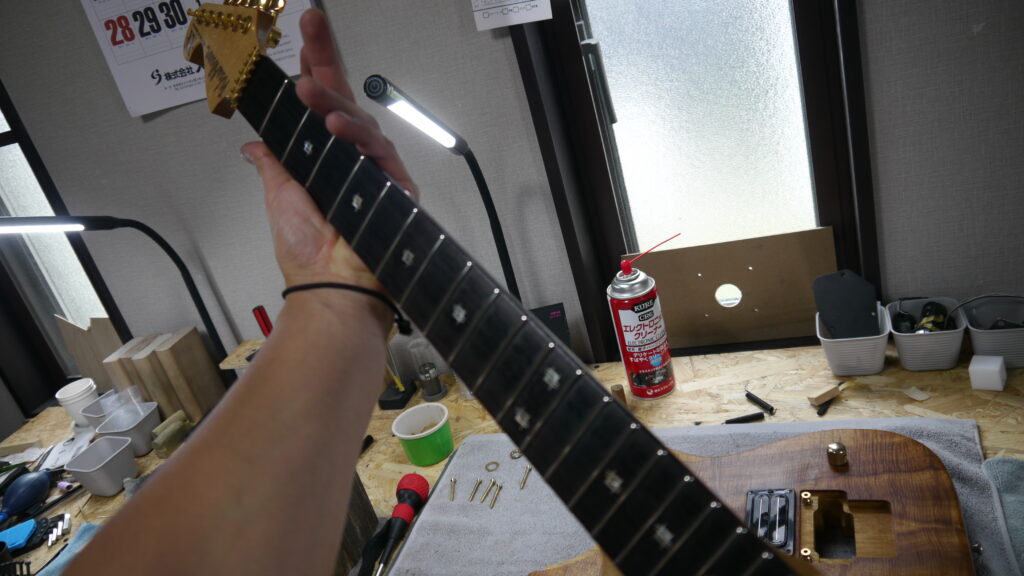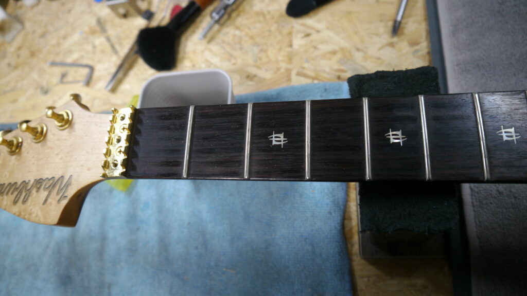 ハイフレットのつまりの原因を解消していきます。フレットの高さや状態を確認しながら、滑らかに演奏できるよう調整を進めてまいります🔧✨