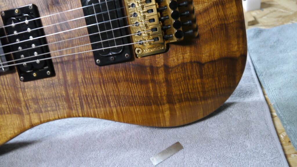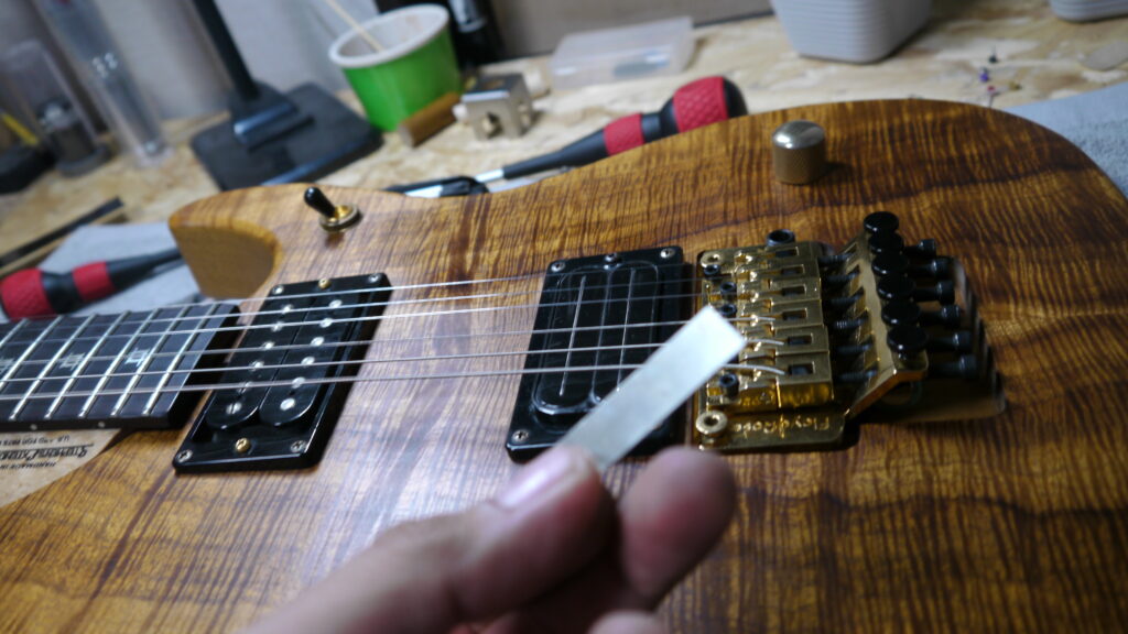 今回はブリッジにシムが付いておりましたが、不要と判断し撤去いたします。これにより適正な弦高バランスが取れるよう調整してまいります🔧✨
