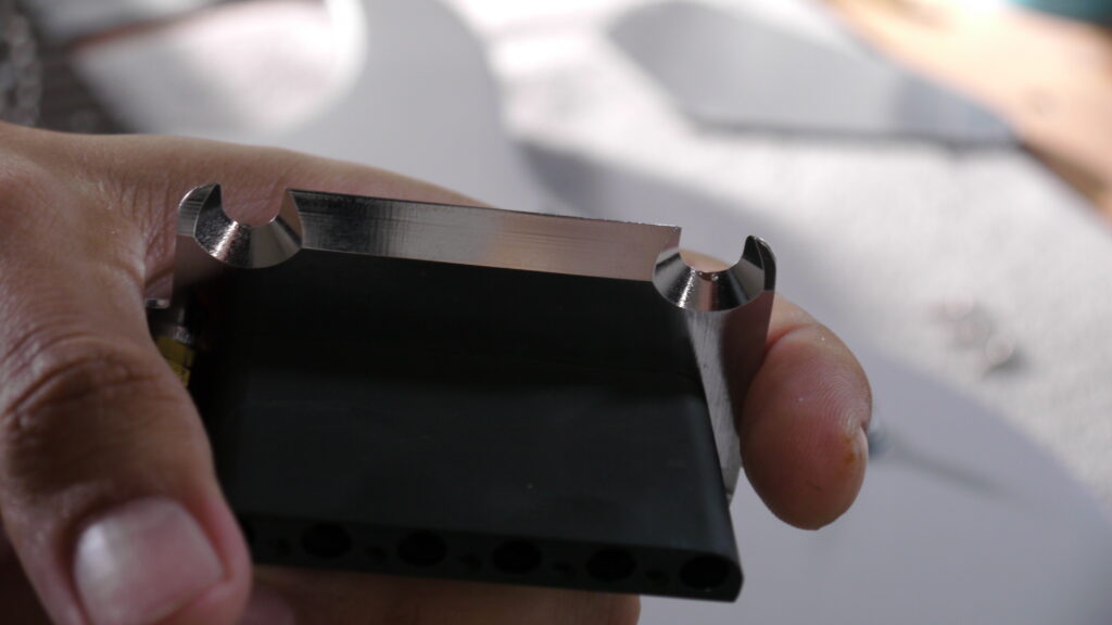 ブリッジのラディアスを見ながら、弦高やサドルの高さなどを全体的にバランスよく調整してまいります。指板の曲面に合わせることで、どのポジションでも安定した弾き心地を実現します📏✨