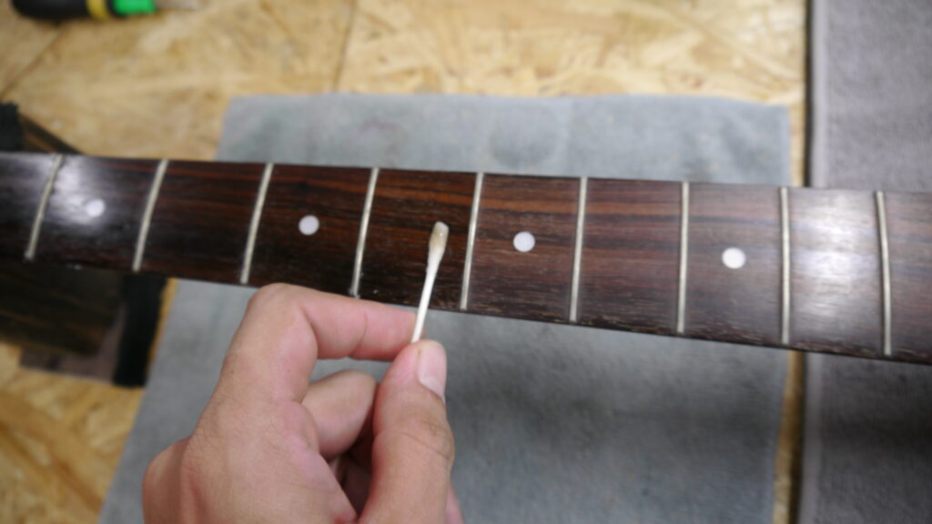 指板のクリーニングとケアを行います。乾燥や汚れが気になるため、オーガニックココナッツオイルを使用して丁寧に保湿しながら整えてまいります🧼✨