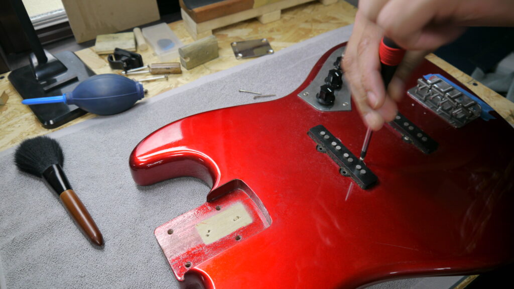 弦を外して、ベース全体をリラックスさせた状態から作業を始めます。テンションが抜けることで、ネックやボディの本来の状態を確認しやすくなります🔧✨