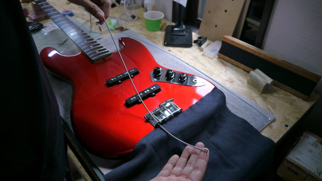 キレイになったベースに弦を付けていきます。一つひとつ丁寧に張り上げ、最終調整へと進んでまいります🎸✨